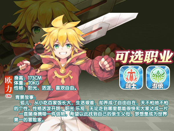 作为艾瑞尔大陆上的百搭CP,阳光正太欧力真的是人气颇高。别看欧力这么活泼开朗,欧力其实是一个孤儿,从小吃百家饭长大,但坎坷的人生并没有磨去欧力乐观的个性,他依旧热爱生活,走到哪里都能和大家打成一片。欧力还会随身携带一枚信物,希望凭借它找到自己的亲生父母。这样自由自在又阳光的欧力,他的职业发展可是游侠和剑士哦!