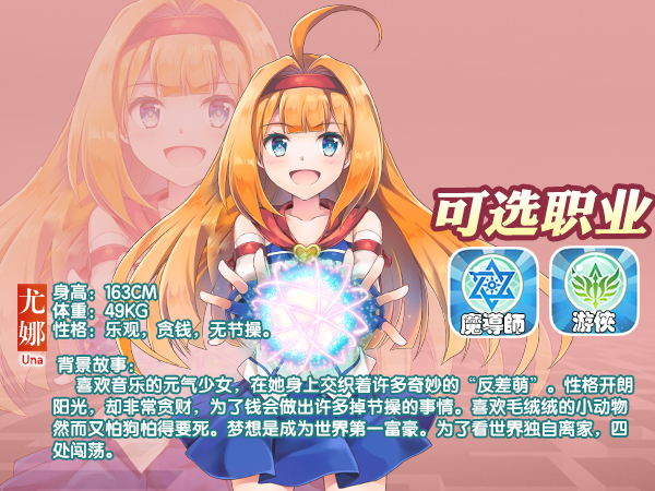 可爱率真的制服娘尤娜是一个十分热爱音乐的元气少女,她的身上交织着许多奇妙的“反差萌”,比如性格十分开朗的她却十分拜金,会为钱做许多无节操的事情。虽然喜欢毛绒绒的小动物,却十分害怕狗。她独自一人离开家只是为了看看外面的世界。这样一个乐观又自由的人,她的职业发展必然是自由自在的游侠和帮助、治愈他人的圣职者!