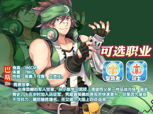 肌肉大叔巴斯是号称艾瑞尔大陆上最可靠的人,可能这与他的身世有关,巴斯大叔出生在一个显赫的军人世家,他从小就努力习武,渴望像家族的前辈一样留名青史,可惜的是,由于一些不可抗力,巴斯大叔流落到了艾瑞尔大陆,隐姓埋名,无法实现自己的抱负。喵酱可是真心喜爱巴斯大叔爽朗大气的性格呢!当然,这么英勇又温暖的治愈型大叔,他的职业发展可是米娜桑一直都很喜爱的圣职者和剑士哦!