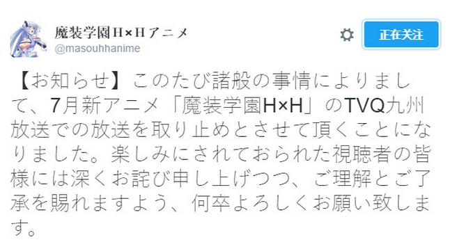 取消这部动画播出的 TVQ九州并非是首播电视台,而是在 AT-X、Tokyo MX 这样的大电视台播出后一周跟播,而且播出时间安排在了每周三的凌晨 3 点多播出,这个时间段也没什么人看电视了早就该睡觉睡觉了,连这个时间段都容不下《魔装学园 H×H》。不过像 AT-X 这样的付费频道倒不会受什么影响,只不过 AT-X 播出的正式版是否会有和谐还是令人挺好奇的,说起来国内 B 站买了这部动画的版权,如果像顺利播出的话,只怕是这部动画在 B 站只能播出大段阉割版本,即便画面可以用圣光暗牧解决,但是角色的那销魂的娇喘就很麻烦了。