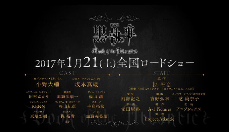 理论上预定在 2017 年春天上映的豪华客船篇将是《黑执事》系列的第一部剧场版动画,之前的 OVA 只是在电影院举办上映活动,豪华客船篇对应的是原作漫画第 11 卷到第 14 卷的内容,夏尔和赛巴斯二人为了找寻死者复生的秘密,卷入了豪华客船坎帕尼亚号的事件当中,这此的剧场版按照第三部 TV 版后的命名方式「黒執事 Book of the Atlantic」,制作团队也是第三部以来的人马,阿部记之监督与吉野弘幸系列构成。