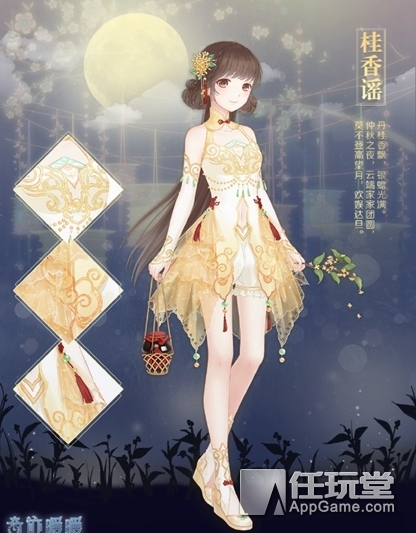 今年的中秋新套装为月舞霓裳和桂香谣,其中月舞霓裳套装里还包括了满月与云彩,而具体的获取形式和时间预告将会在之后的公告中释出。