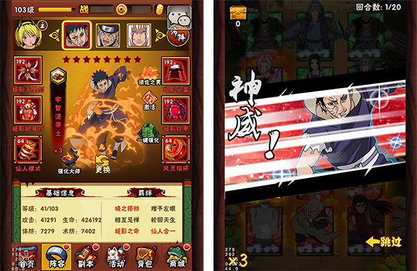 神威Lv.1:对前排敌人造成246%伤害,80%概率减少2点怒气,自身闪避提高30%,持续2回合。我方随机2个忍者恢复生命(80%),持续1回合。