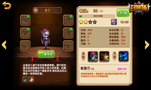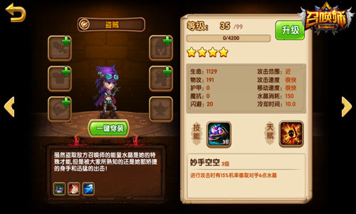 盗贼——低投资高回报!入手简单,培养容易,每位刚入坑的玩家必备的英雄。冷却仅仅10秒,自带技能可以偷取敌方水晶,PVP中抢节奏的神卡,三个天赋都在强调:快、更快!快攻之中的核心,虽然自身很脆,但是一但摸到了召唤师本体那就不亏!