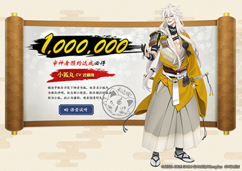 审神者预约达100万:游戏公测后,审神者必得“小狐丸”。