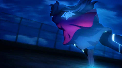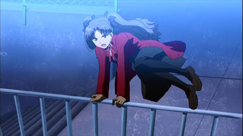 凛为了躲避Lancer,直接从楼顶跳下来的一幕,旧版是……就是跳楼!新版则因为顶楼全都筑起围篱,所以利用魔术跳过。学生静止模仿!