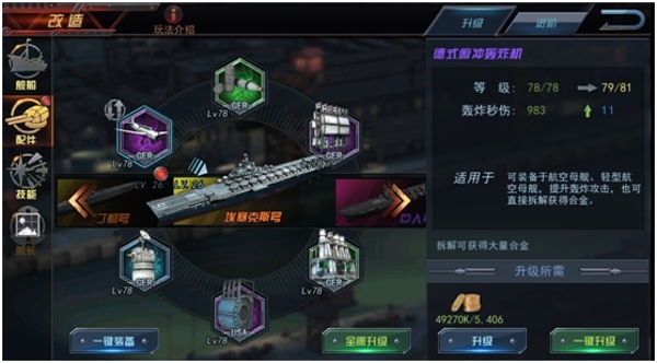 战舰的配件是影响战舰实力的重要组成部分,以航空母舰为例,配件分别需要轰炸机、弹药、发动机、雷达、防雷舱、重型装甲,搜集精良的配件为其搭配组装,是游戏中重要的组成部分。