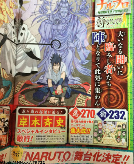 【M站 老南街 整理报道】最近「火影忍者」真是火爆了,这当然是因为陪伴着我们15年的它,还有五周即将完结的原因啦!相信2014年10月6日或许是会成为全球火影迷难以忘怀的日子,因为火影在那天宣布完结!然而最近被炒得沸沸扬扬的更是它的结局,每个人都在猜测着结局到底会怎么样。对于完结篇的故事结尾,早有同人作品杜撰了各种版本的结局。尽管火影忍者原创团队没有透露更多细节,但随着火影完结信息的爆出,有日本媒体报出了“岸本为火影设计开放式结局”的消息,引来更多猜测。在各大贴吧中更有出现相关结局手稿泄露的内容,这会是真的么?在这紧张时刻,「火影忍者」传来新的消息——竟然决定将舞台剧化!并且宣布将会在明年3月份公演!