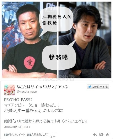 【M站 老南街 整理报道】虚渊玄:我被吓到了!虚渊玄近日在德岛嘉年华的活动上谈《心理测量者》时直言“二期的恶心程度连我这个从头开始看的人都吓傻眼了!”。网友预感可能又有一大批人要排队领便当了,难怪老虚之前在翠星的活动上强行甩锅“二期要死人的话你们怪冲方丁去吧”。