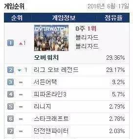 另外根据6月27日Gametrics的数据统计,《守望先锋》在韩国网吧的占有率已经突破了30%,继续保持第一位,而《英雄联盟》则是跌破了28%。二者之间的差距近期亦呈现扩大趋势。