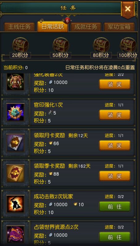 日常活跃会列出玩家每日要做的事情,让玩家更清楚的知道自己每天的目标,而不会盲目进行一些操作。完成活跃任务,可以获得声望,这为玩家的升官之路提供了强有力的助理。而活跃积分达到系统要求,还会得到额外的收益。