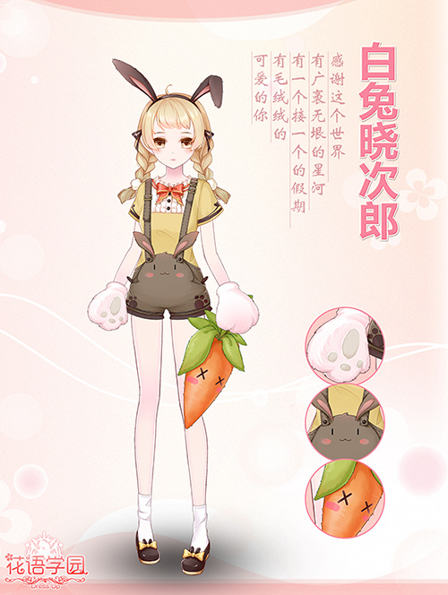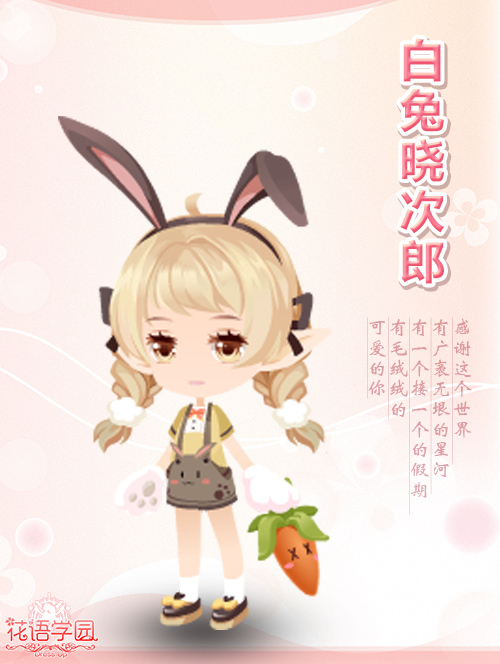 在最近一部很火的动画电影里,带头大哥小白兔可谓是颠覆了大家对兔子温顺可爱的传统印象。不过兔子到一直是最常见最受人喜爱的宠物之一。白兔晓次郎套装(设计者:热心玩家寒夜和白娘)还是一直温顺可爱的小兔子,背带裤一直都是萝莉的最爱之一,加上兔耳发箍、抱枕和兔掌,确实是扮萌减龄的利器。