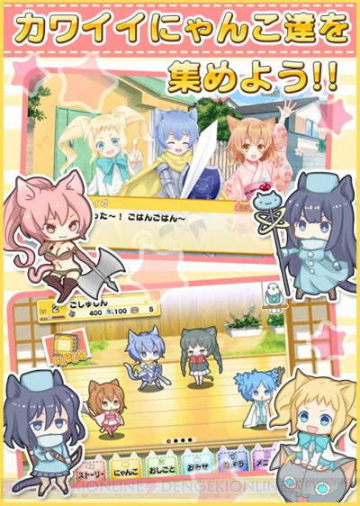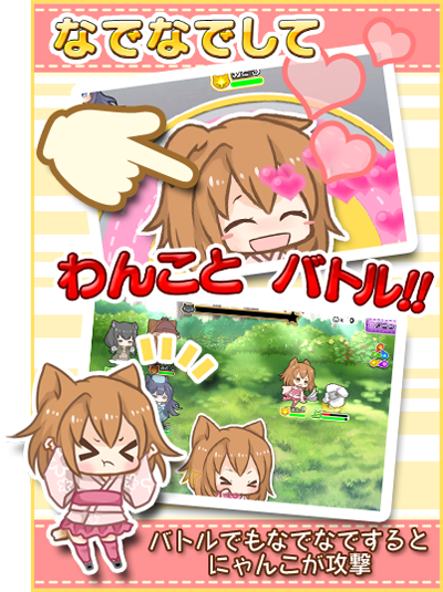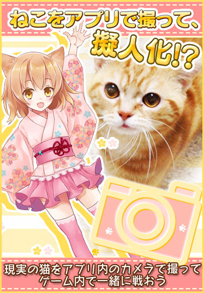 在游戏中,玩家要用内藏的“喵喵照相机”对现实中的猫咪拍照,之后程序会根据猫咪的不同而生成不同的可爱拟人化猫耳美少女,然后玩家就可以进行育成。拟人化的猫咪会有各自不同的属性和数值,即便是看上去很像的角色,属性能力也有不同。与敌人“汪星人”战斗的时候,玩家用抚摸的方式让猫耳娘进行攻击。这是名副其实的育成战斗。