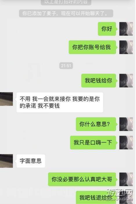 女主播事后加了“收割麦子”的微信,说要把钱退给他,但是对方并不接受。
