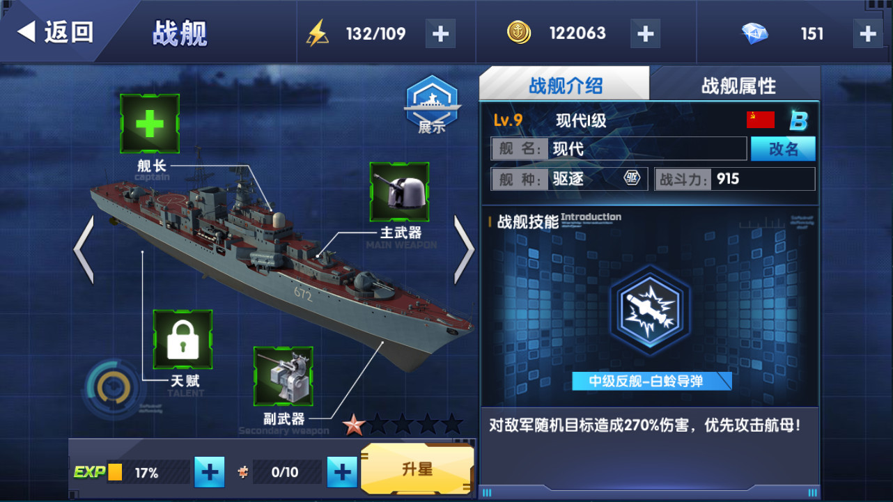 《钢铁舰队》中的舰船分为驱逐舰、巡洋舰、护卫舰、航母、潜艇五类,而每种舰船携带有五类战斗技能,分别为反舰、反潜、航空、潜射、防空五类技能,玩家可依据技能选择各类战舰,组成战斗阵容。
