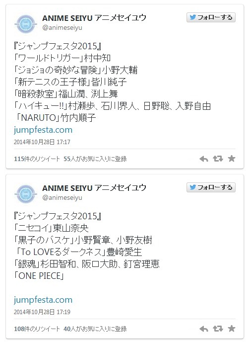 日本当之无愧的第一漫画杂志《周刊少年JUMP》一年一度的庆典“JUMP FESTA 2015”今年预定于12月20日~21日举行。目前出演阵容已经发表,十分豪华。