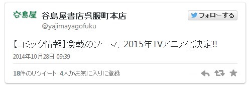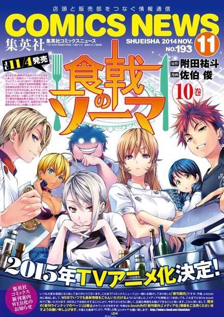 此前,我们有报道过佐伯俊的日本料理漫画《食戟之灵》将有“重大发表”!看来和我们猜的是一样的,这回真的是来动画化决定了!由附田祐斗原作,佐伯俊作画的Jump美食漫画《食戟之灵》如今公布了TV动画化的消息,动画将于2015年面世。其实此前就曾传出动画化的消息,而以目前《食戟之灵》在JUMP的人气排名来看,TV动画是只是时间问题而已。