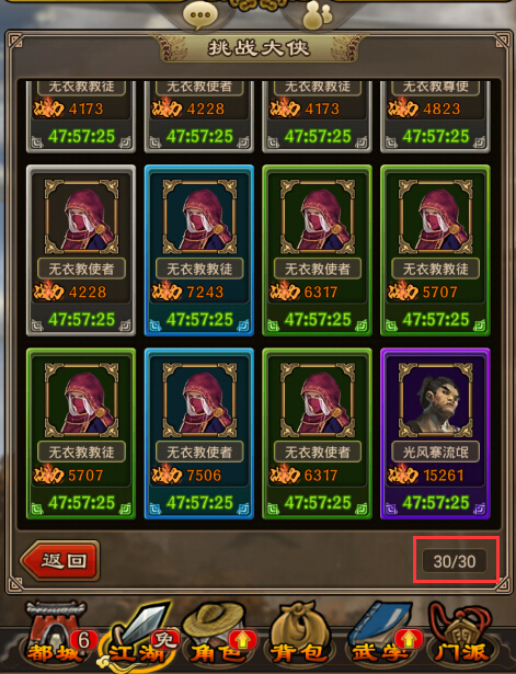 大侠均来自于“江湖历练”中,玩家通过自动挂机有机会遭遇到大侠,遭遇到的大侠都会在“挑战大侠”中显示,需要注意的是“挑战大侠”中最多可同时存在30位大侠,超过30位玩家在江湖历练中将不再遭遇大侠。同时每位大侠存在的时间是48小时,超过时间,如果玩家没有成功挑战大侠,该大侠就会消失。在图中您能看到大侠的战力,剩余存在时间,现有大侠数量(图中红框位置)等信息。
