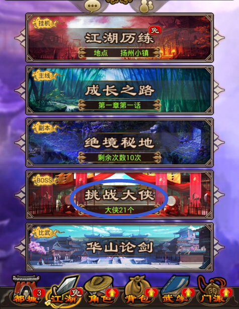 点击江湖图标,在主界面我们就能看到“挑战大侠”,点击就可以进入挑战大侠。