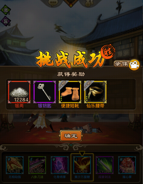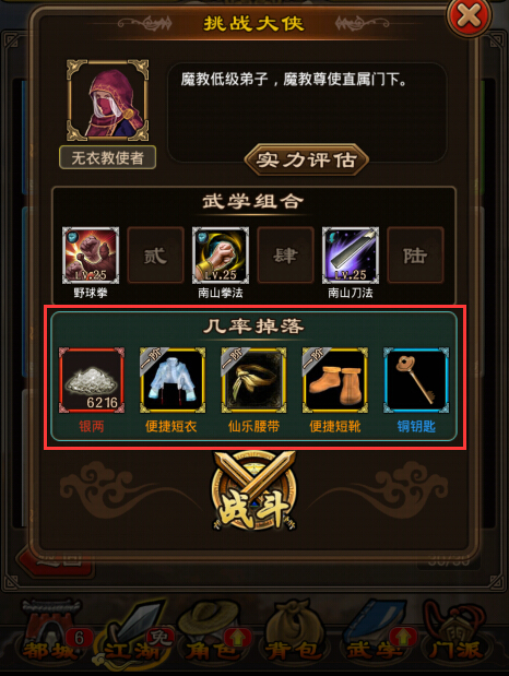 在挑战大侠界面下,点击您想挑战的大侠就会出现上图,您可以看到该大侠的简介,武学组合,挑战胜利后可能掉落的物品。点击实力评估,您可以了解到您是否有把握挑战成功该大侠。点击战斗就可以开始挑战大侠。如果您能挑战成功,则会获得奖励,该大侠也会消失。如果您挑战大侠失败该大侠将继续存留在“挑战大侠”中直到您挑战成功或到时间自动消失。