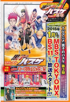 【M站 老南街 整理报道】2015年放送预定的TV动画《黑子的篮球》第3期将在2015年1月开始放送,并公开洛山高校的新登场角色声优。新登场角色为洛山高校“无冠的五将”:刚力根武谷永吉(CV:藤原贵弘)、“夜叉”实渕玲央(CV:羽多野渉)以及“雷兽”叶山小太郎(CV:增田俊数)。