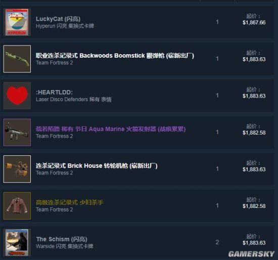 Steam上最贵的社区市场物品:这个说法其实有点不恰当,因为市场物品总是在不断波动的,但是我们可以从价格范围来看出来,大多数要价1800多刀的物品,价格炒的很高的前几位里,除了卡牌,帽子2的装扮倒有不少,当然《Dota2》和《CS:GO》的很多物品也是喜闻乐见的高价物。