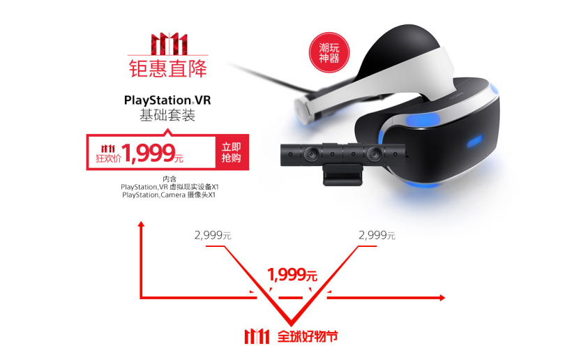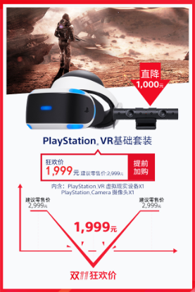VR已不再是遥不可及的未来,虚拟现实尽在眼前!戴上PlayStation VR,你将被360°全方位包围,体验身临其境的三维空间,更加沉浸式地畅享PlayStation带来的真实游戏体验。PlayStation VR基础套装(包含虚拟现实设备及摄像头)本次双11大促最低1999元,直降1000大洋,可以说真的是“错过这村没这店”的良心价了。