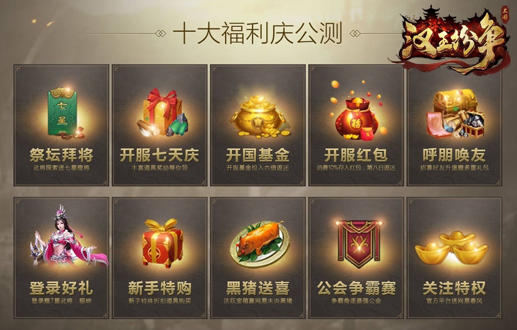 公测之际,为了回馈大家的陪伴与期许,官方特别为城主们准备了七星橙将、开国基金、开服红包、超值道具、豪华礼包等重磅大礼,为城主们在汉王大世界中的策略变革之路加油助威!