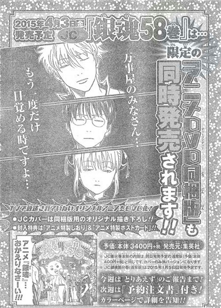【M站 老南街 整理报道】根据今年第50期集英社旗下刊物「周刊少年Jump」上的情报,动画版「银魂」要回来了,网友纷纷表示欢迎回来!其实是「银魂」漫画第58卷将于2015年4月3日发售,限定版将同捆OAD,此次内容为TV版未放送的原创动画!而在宣传标签上,“万事屋的各位,是苏醒一次的时候了。”的字样清晰可见。