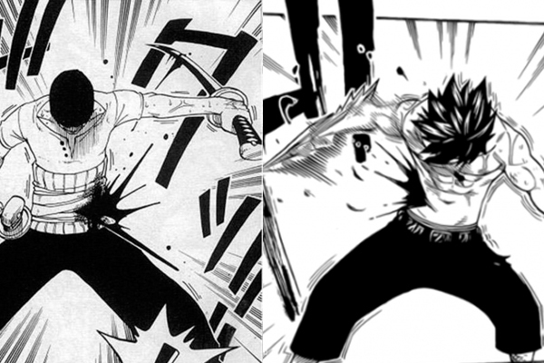 晚于《海贼王》连载的《妖精的尾巴》被说抄袭,还真不是空口污蔑。首先,这两者的画风非常相近。上图中两个角色分别为海贼王中的男二号索隆、妖尾中的男二号格雷。如果不仔细看,恐怕还真会以为是同一个角色。其次,海贼王的画风众所周知的非常有特色,而妖尾的画风能够如此贴近海贼王,自然脱不了“抄袭”的嫌疑。