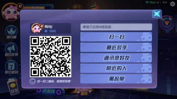 在主页面左下角点击“好友”,可进入到好友界面,点击添加好友按钮,即可看到“扫一扫”功能和玩家自己的二维码,通过扫码添加好友达到五人,即可领取超萌的电眼猫头像!