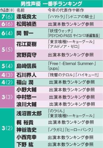 【M站 Nitsqgie 整理报道】各位,2014年还有七个礼拜就要结束了喔(′・ω・`)一年的尾声已至,大家今年看了多少动画呢?今年看的动画当中,有哪位声优的名字在cast名单频繁出现到让你觉得「怎么又看到他」呢?以下由日经娱乐统计今年一至九月动画(含OVA电影)《2014年动画出演数》男声优排行榜,就先来看看今年动画工作最多的男声优有谁吧~