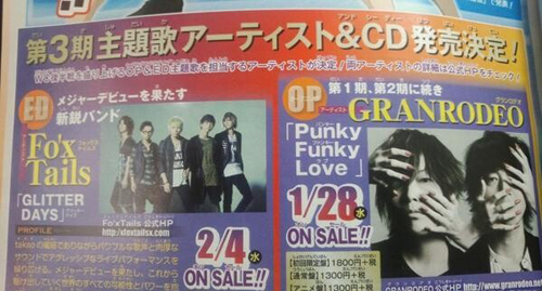 曾为这部系列作品演唱过多首片头曲的摇滚乐团“GRANRODEO”将继续担当新作的片头曲“Punky Funky Love”的演唱,而收录此曲的单曲CD计划于明年1月28日发售。此外,新锐乐队“Fox Tails”,则将携他们的新曲“GLITTER DAYS”作为本次新作动画的片尾曲,而他们的这张出道单曲则将于明年2月4日面世。