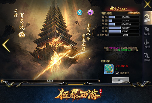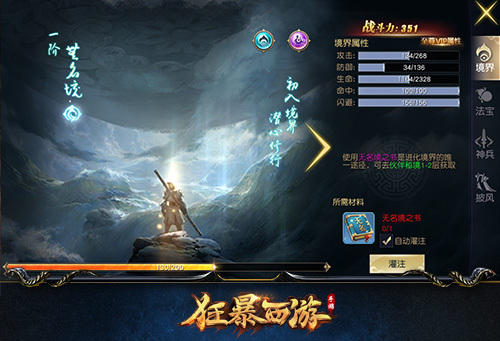 那么如何提升境界呢?境界提升体系为垂直线性成长,通过灌注、进阶两个步骤可实现境界提升。每次灌注可随机增加一种属性值,并消耗一定数量的对应境界书,当灌注经验条灌满后,需要消耗进阶石提升祝福值来进行逐步进阶,从而最后完成境界的提升。