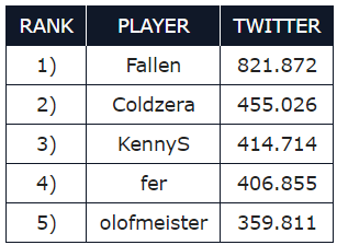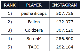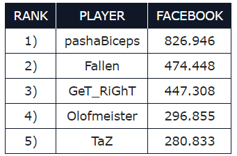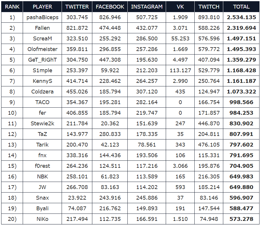近日,有国外网友对现役CS:GO职业选手进行了人气统计,综合了选手们推特、Facebook、Instagram、VK(俄罗斯社交网络平台)等社交网络的关注人数,以及Twitch的直播关注度。