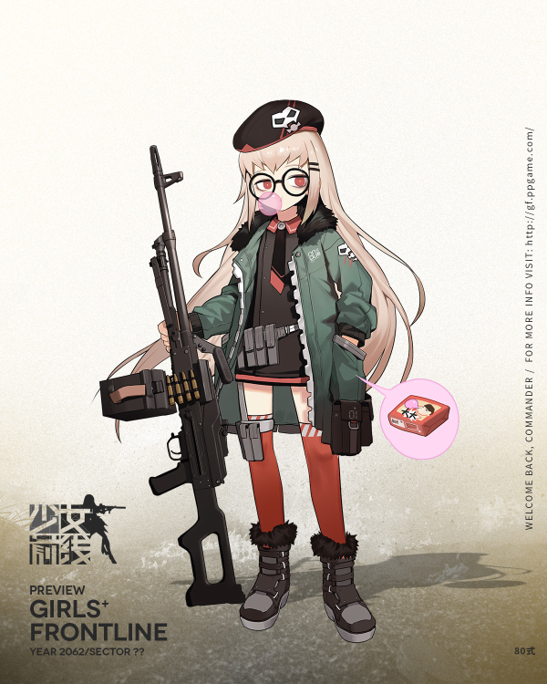 亲爱的指挥官们,今天为大家带来的是全新四星机枪战术人形80式的介绍!80式又称1980年式通用机枪,由中国北方工业公司研制及生产,基于PKM系列通用机枪测绘仿制而成。在《少女前线》中,80式是一位散漫随意的娇小战术少女,她喜欢嚼泡泡糖来打发时间(似乎牌子是大O卷)。她在游戏中会有怎样的表现呢?指挥官们,准备好迎接她吧!