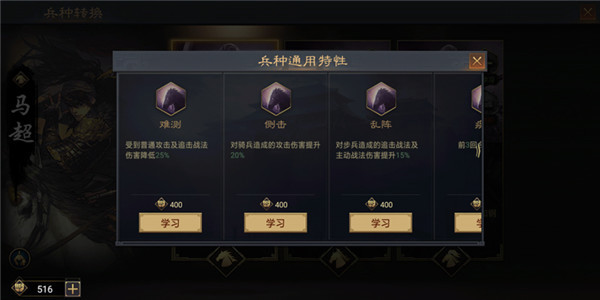 转换为高级兵种后,武将可获得该高级兵种的专属特性,如轻骑兵可获得速度属性的大幅提升,来去如风,具有极高的机动性,适合疾驰而援快速作战。此外,转换为高级兵种后,武将还将解锁第一个通用特性栏,可学习一个通用特性。