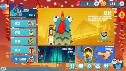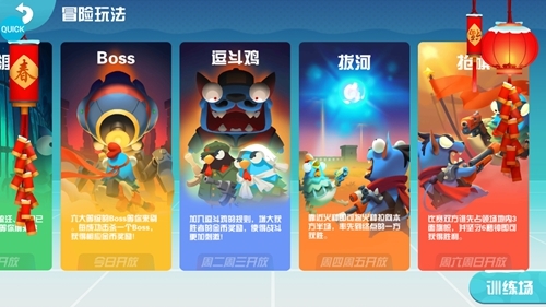在《萌鸡敢死队》中,除了大多数游戏中传统的PVE玩法以及PVP排位赛以外,还有多种搞怪另类、激情有趣的玩法。周一开放的BOSS战,六大等级的BOSS等你来刷,每成功击杀一个BOSS即可获得丰厚的金币奖励;周二周三开放的逗斗鸡,独创搞怪玩法,增加获胜者的金币奖励,使战斗更加刺激;周四周五开放的拔河玩法,与“鸡友”并肩作战,相互配合赢取胜利;周末开放的抢旗玩法,与对手斗智斗勇,激情对决策略为王。总之,《萌鸡敢死队》将给大家带来不同的游戏乐趣,让你一玩起来就停不下来!
