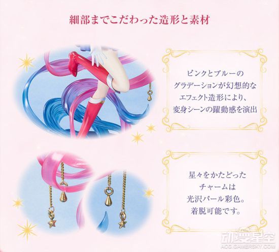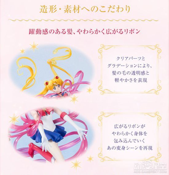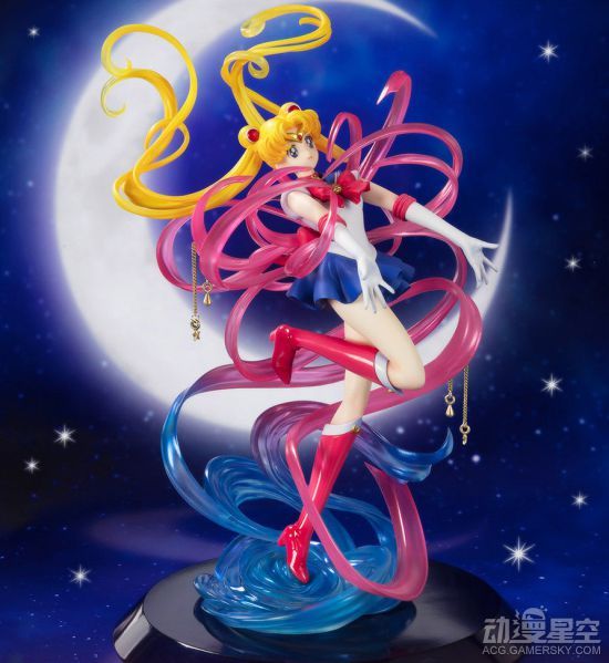 本款手办还原了月野兔变身时的经典场景,各种特效与飘舞长发搭配出梦幻般的色彩。此外,制作者有意突出发丝透明轻盈的感觉,并用红蓝两种渐变色特效萦绕在小兔周身,配合光泽白皙的美腿和水手服短裙共同欣赏,华美的少女心渐渐被唤醒。