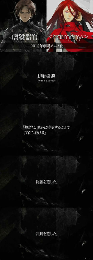NoitaminA新剧场动画企划《ITOH PROJECT》公开 樱井孝宏旁白版PV。改编自英年早逝的SF小说家伊藤计划的两部小说《虐杀器官》与《和谐》,2015年上映。