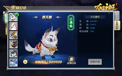 在坐骑形象设定方面,吞天兽初期形象为雪狗,首测开放了朱隐、耀金独角、虚空幻鳐、幽影麒麟、九天玄风、鎏金九隐等稀有圣兽坐骑幻化形象。除了丰富的幻化坐骑外观外,各类幻化坐骑分别拥有专属技能,惊人的技能增幅效果,分为通用、PVP两大触发类型。