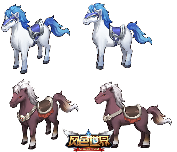 首先要介绍的是我们人见人爱的初始坐骑小马驹儿。下图中分别是游戏中的“白光驹”和“地雾驹”。从原画中就能看出,初始坐骑虽然憨态可掬,还是造型还是比较传统、比较简洁的。