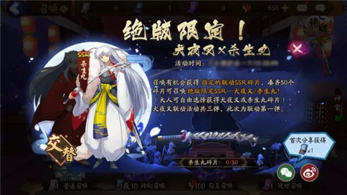1.本期联动活动共三弹,本次活动为第一弹,犬夜叉、杀生丸只能通过三次联动活动获得。2.在使用神秘的符咒、勾玉、现世符咒召唤前,阴阳师们可自由选择获得犬夜叉或杀生丸碎片,召唤时概率获得的碎片为该指定角色的碎片。