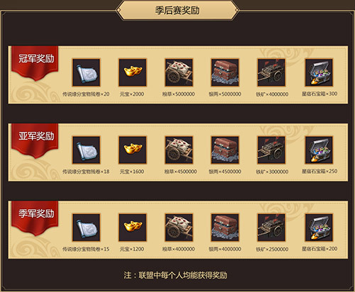 在S4版本,排名奖励也有所改动。为了鼓励各位主公更加积极地进入乱世争霸夺取更高的荣誉,我们也为大家准备了更加丰厚的奖励。奖励新增了星宿石宝箱,而其他奖励也对应增加了一定数量。前三名依旧可获得传说缘分宝图碎片,第四到第八名则获得高级缘分宝图碎片,第八名之后到第三十二名是数量不等的普通缘分宝图碎片。一将功成万骨枯,破甲万千,封侯拜相,论功行赏,战斗吧各位主公们!