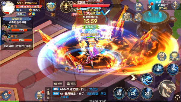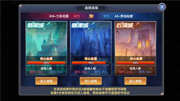 系统会从报名的玩家中选择战力排名前60的进入战场,在战场的3个城池中展开攻防拉锯战。服战分为两轮,双方骑士团轮番扮演战场的进攻方or防守方,以水晶破坏或者时间终结为结束。玩家可在战斗中随意在三个城池中切换,通过语音系统开黑商讨战力分配是获胜的关键。一波强推流还是猥琐防守流?一起来斗智斗勇吧!