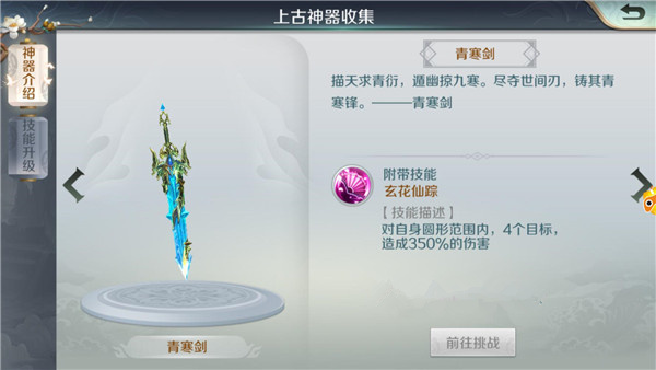 清寒剑:一旦出鞘,顿时无穷冰寒之气笼罩四周,非天道圣人不可抵挡。获得清寒剑后,可解锁技能玄花仙踪。
