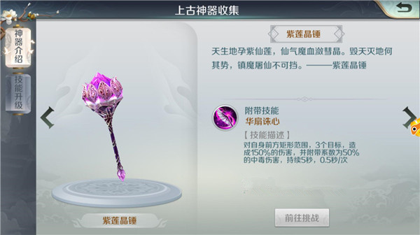 紫莲晶锤:传说是伏羲提取仙界紫莲的神力,再加入自己的神力一起注入仙玉所制出的神器,其散发出的字色光明能让人感到宁静祥和,获得紫莲晶锤后,可解锁技能华扇诛心。