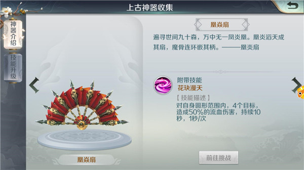 凤焱扇:此扇上篆刻太乙玄纹,具有一扇起风二扇起火的神力,获得凤焱扇后,可解锁技能花诀漫天。