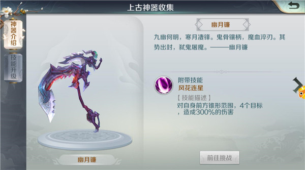 幽月镰:传说天地混沌之初,盘古劈开天与地所用的神斧,蕴藏开天辟地之力,劈开天地之后,神斧也损毁成碎片,而这些碎片重新熔铸之后,就成了神器幽月镰,获得幽月镰后,可解锁技能风花连星。