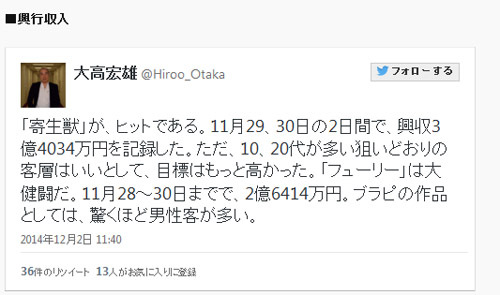 既好评如潮之,则钱途无量之!真人电影「寄生兽」从11月29日首映到30日两天时间便创下了3亿4034万票房收入佳绩。粉丝们也纷纷表示“「寄生兽」电影很有趣”、“作为原作读者没有什么特别的不满”、“‘小右’很可爱(可惜CV不是胡来的团长)”等,对剧情、CG等方面给予了很高的评价。